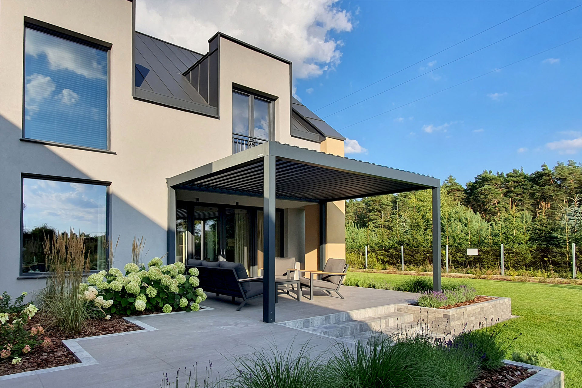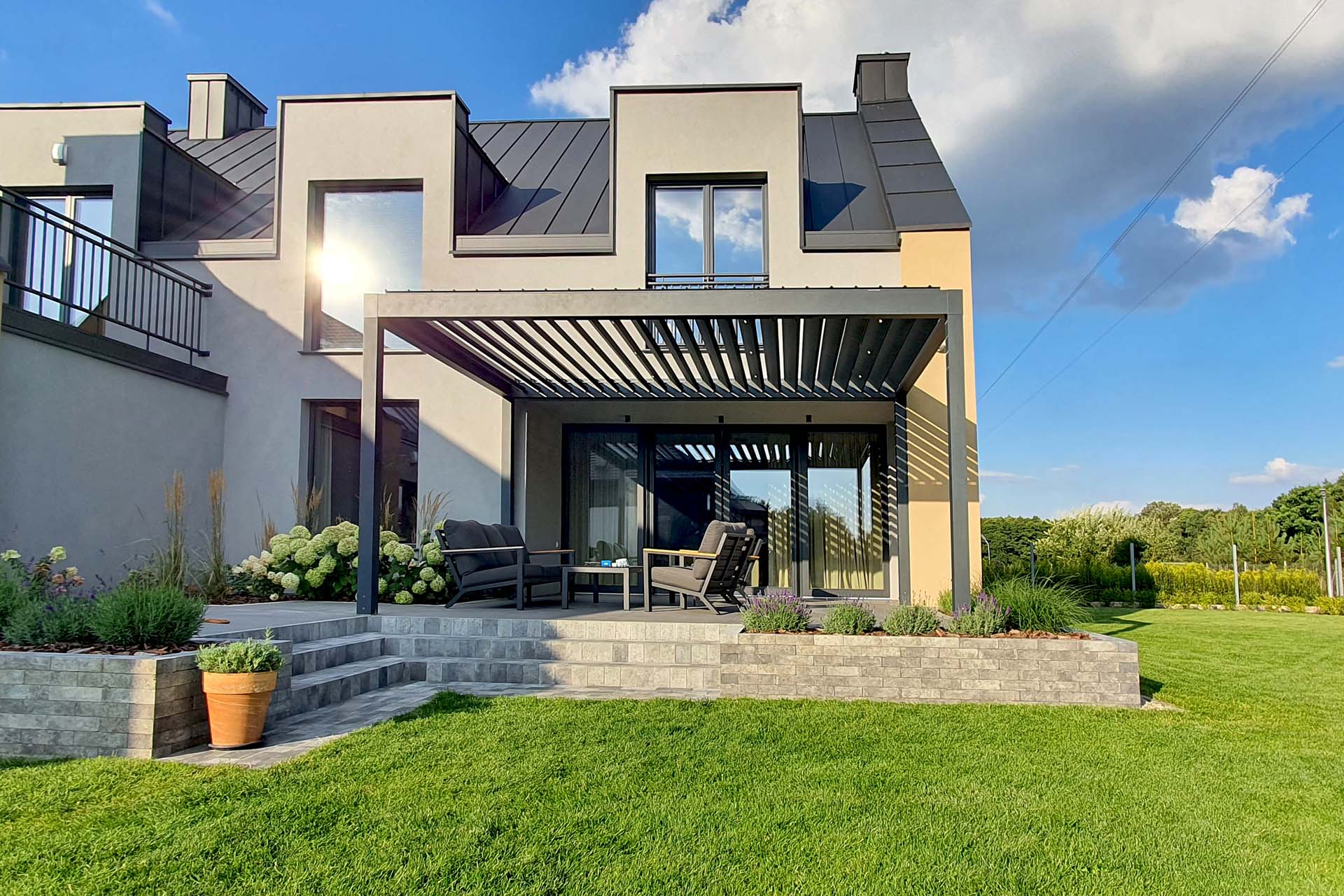 Zadaszenie bioklimatyczne Tarasola Technic to nowoczesna pergola aluminiowa. Jej konstrukcja cechuje się odpornością na wiatr do 120 km/h i skuteczną ochroną przed słońcem, deszczem oraz śniegiem. Zintegrowany system odprowadzania wody oraz dach z lamelami obrotowymi (0–135°) gwarantują komfort użytkowania. Wyposażona w zabudowę boczna i montaż dodatkowych akcesoriów. Całością steruje się za pomocą pilota lub aplikacji mobilnej. To eleganckie i funkcjonalne rozwiązanie sprawdzi się jako przedłużenie salonu, ogrodowy pawilon lub zadaszenie w betonowej opasce.